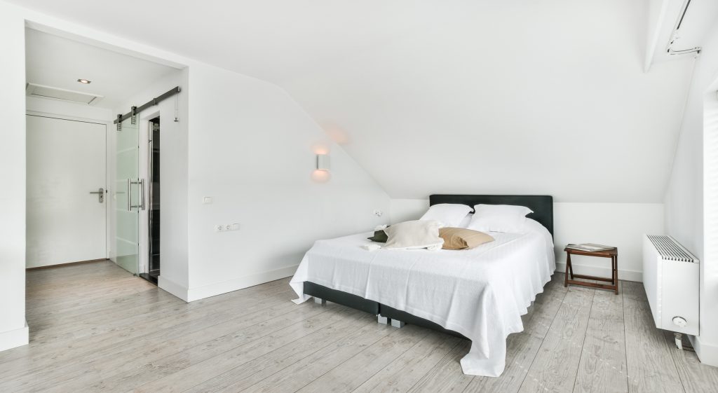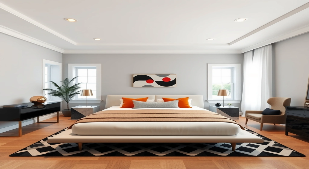 Stage this empty Airbnb bedroom in a modern design. Use light grey walls with white crown molding, a smooth matte-finish white ceiling with recessed LED downlights. Add a queen-sized platform bed with a low-profile headboard, dressed in neutral bedding with bold accent pillows. Include sleek nightstands with metallic table lamps, a mid-century modern armchair by the window, and a geometric area rug. Use natural wood or concrete flooring. Add a large abstract art piece on the main wall and install sheer white curtains to filter soft daylight through wide windows.
